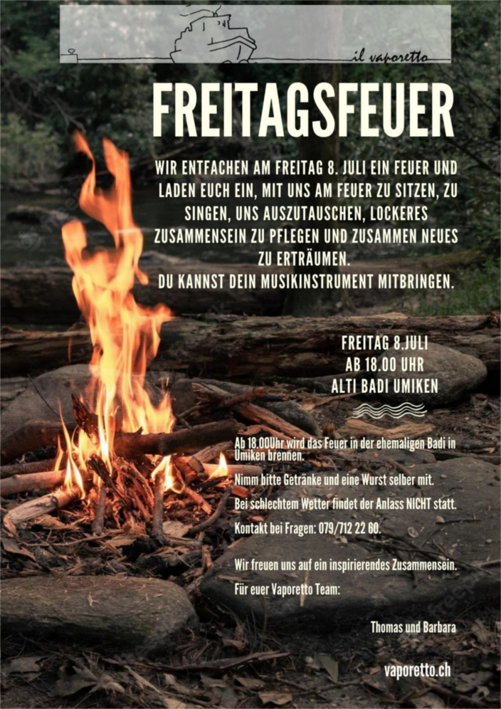 Wir entfachen am Freitag 8. Juli ein Feuer und laden Euch ein, mit uns am Feuer zu sitzen, zu singen, uns auszutauschen, lockeres Zusammensein zu pflegen und zusammen Neues zu erträumen. Du kannst dein Musikinstrument mitbringen.